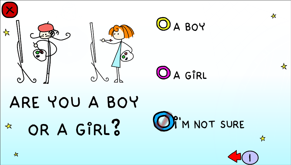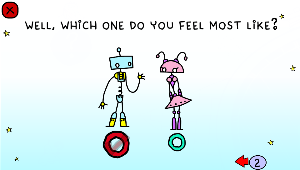 The game consists of two main things - planets - a couple Scribblenauts-like storylines, where what you do and say to the characters influences the game’s perception of your personality (for example, if you choose to hug a crying character, the game deems you a bit closer to the “Sweetheart” archetype), and asteroids - which are straightforward personality quiz questions. I have found the asteroids to be much more fun than the planets, and spent most of my time playing the game doing those. I have yet to complete a single planet storyline.